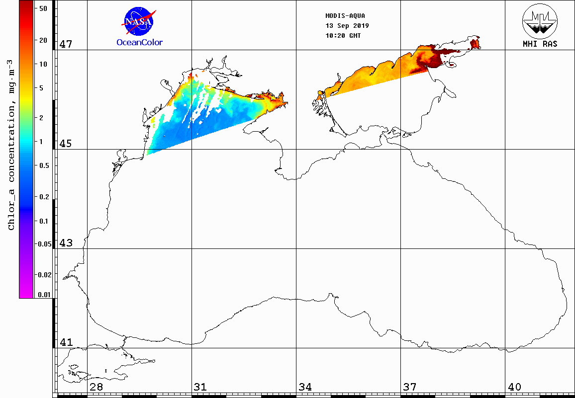 551 нм) и концентрации хлорофилла-А для Чёрного и Азовского морей по данным спектрорадиометра MODIS.