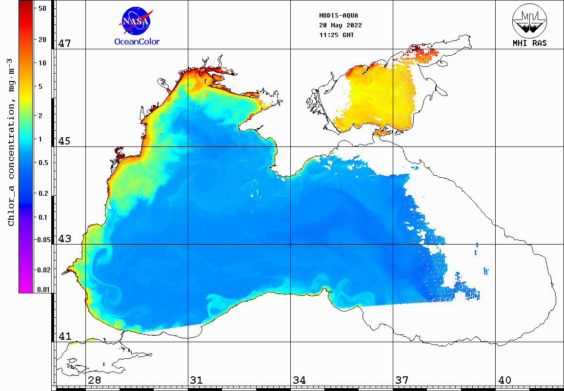 551 нм) и концентрации хлорофилла-А для Чёрного и Азовского морей по данным спектрорадиометра MODIS.