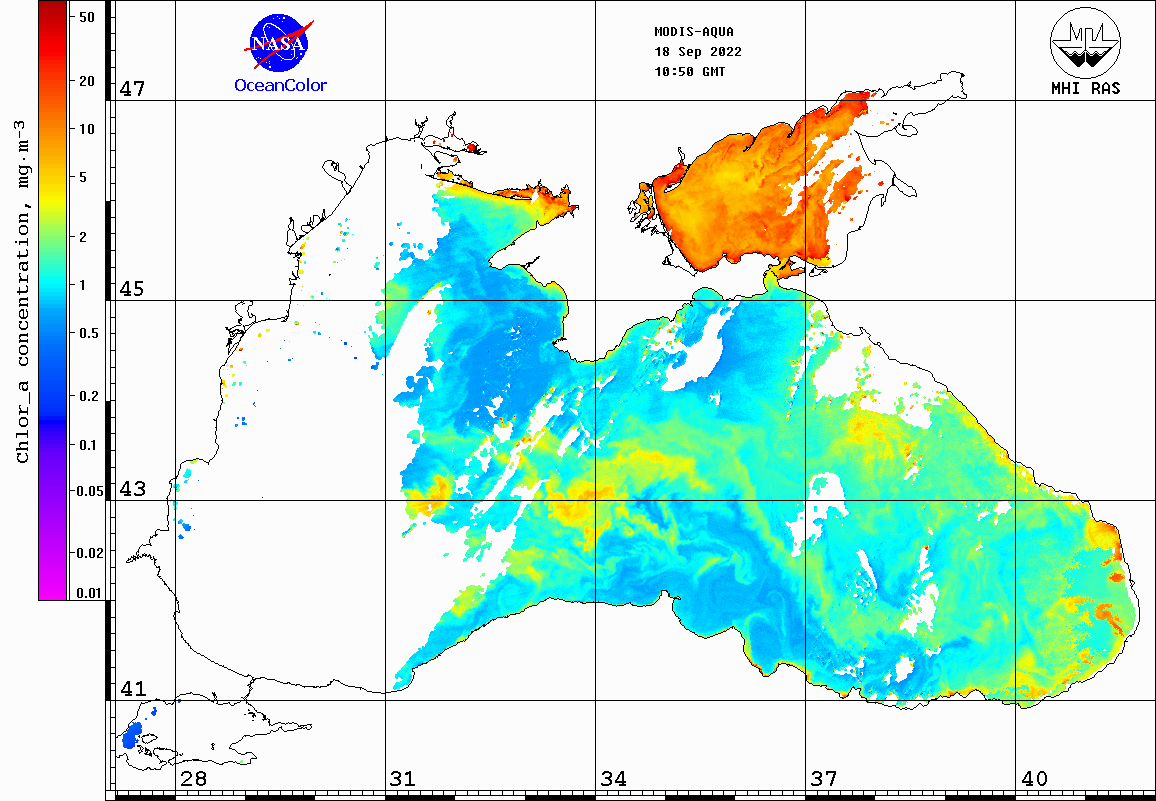 551 нм) и концентрации хлорофилла-А для Чёрного и Азовского морей по данным спектрорадиометра MODIS.