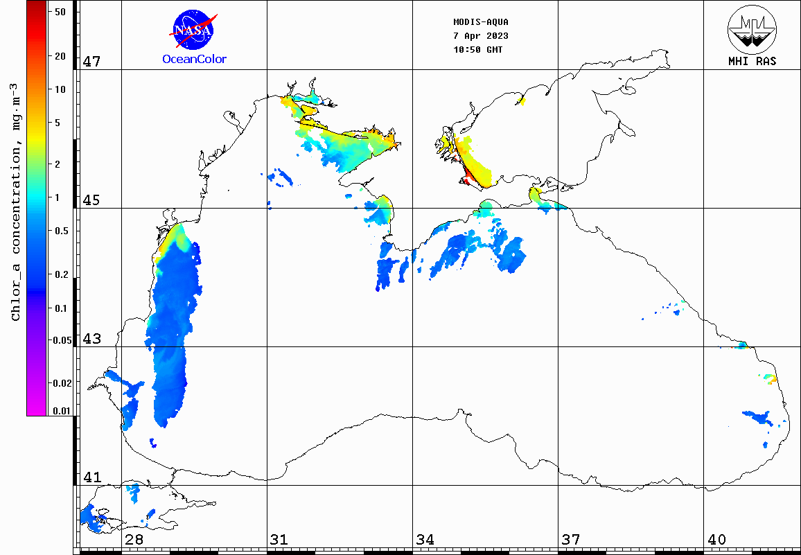 551 нм) и концентрации хлорофилла-А для Чёрного и Азовского морей по данным спектрорадиометра MODIS.